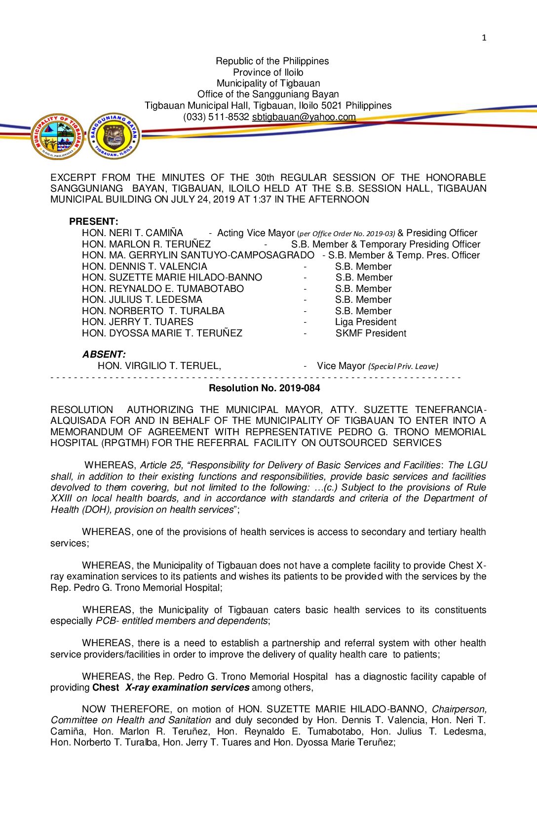 Resolution No. 2019-084 – RESOLUTION AUTHORIZING THE MUNICIPAL MAYOR, ATTY. SUZETTE TENEFRANCIA- ALQUISADA FOR AND IN BEHALF OF THE MUNICIPALITY OF TIGBAUAN TO ENTER INTO A MEMORANDUM OF AGREEMENT WITH REPRESENTATIVE PEDRO G. TRONO MEMORIAL HOSPITAL (RPGTMH) FOR THE REFERRAL FACILITY ON OUTSOURCED SERVICES