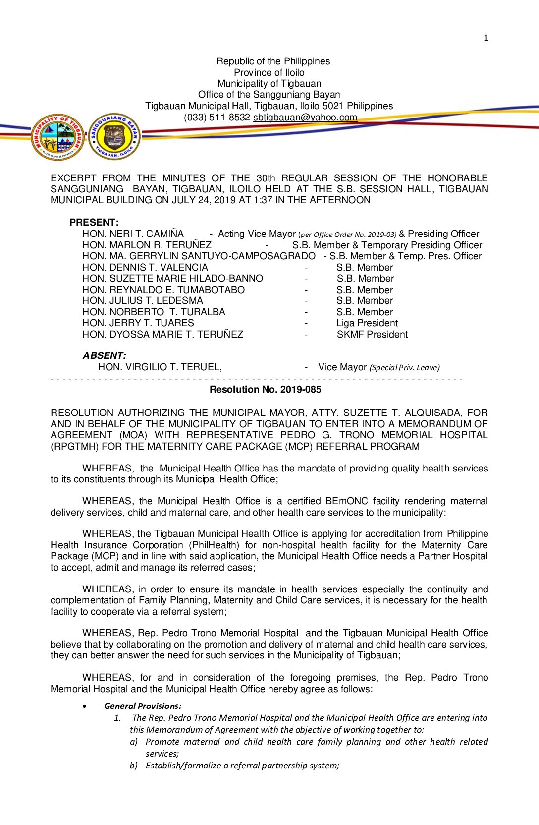 Resolution No. 2019-085 – RESOLUTION AUTHORIZING THE MUNICIPAL MAYOR, ATTY. SUZETTE T. ALQUISADA, FOR AND IN BEHALF OF THE MUNICIPALITY OF TIGBAUAN TO ENTER INTO A MEMORANDUM OF AGREEMENT (MOA) WITH REPRESENTATIVE PEDRO G. TRONO MEMORIAL HOSPITAL (RPGTMH) FOR THE MATERNITY CARE PACKAGE (MCP) REFERRAL PROGRAM