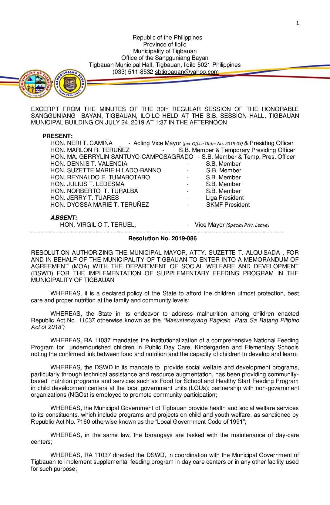 Resolution No. 2019-086 – RESOLUTION AUTHORIZING THE MUNICIPAL MAYOR, ATTY. SUZETTE T. ALQUISADA , FOR AND IN BEHALF OF THE MUNICIPALITY OF TIGBAUAN TO ENTER INTO A MEMORANDUM OF AGREEMENT (MOA) WITH THE DEPARTMENT OF SOCIAL WELFARE AND DEVELOPMENT (DSWD) FOR THE IMPLEMENTATION OF SUPPLEMENTARY FEEDING PROGRAM IN THE MUNICIPALITY OF TIGBAUAN