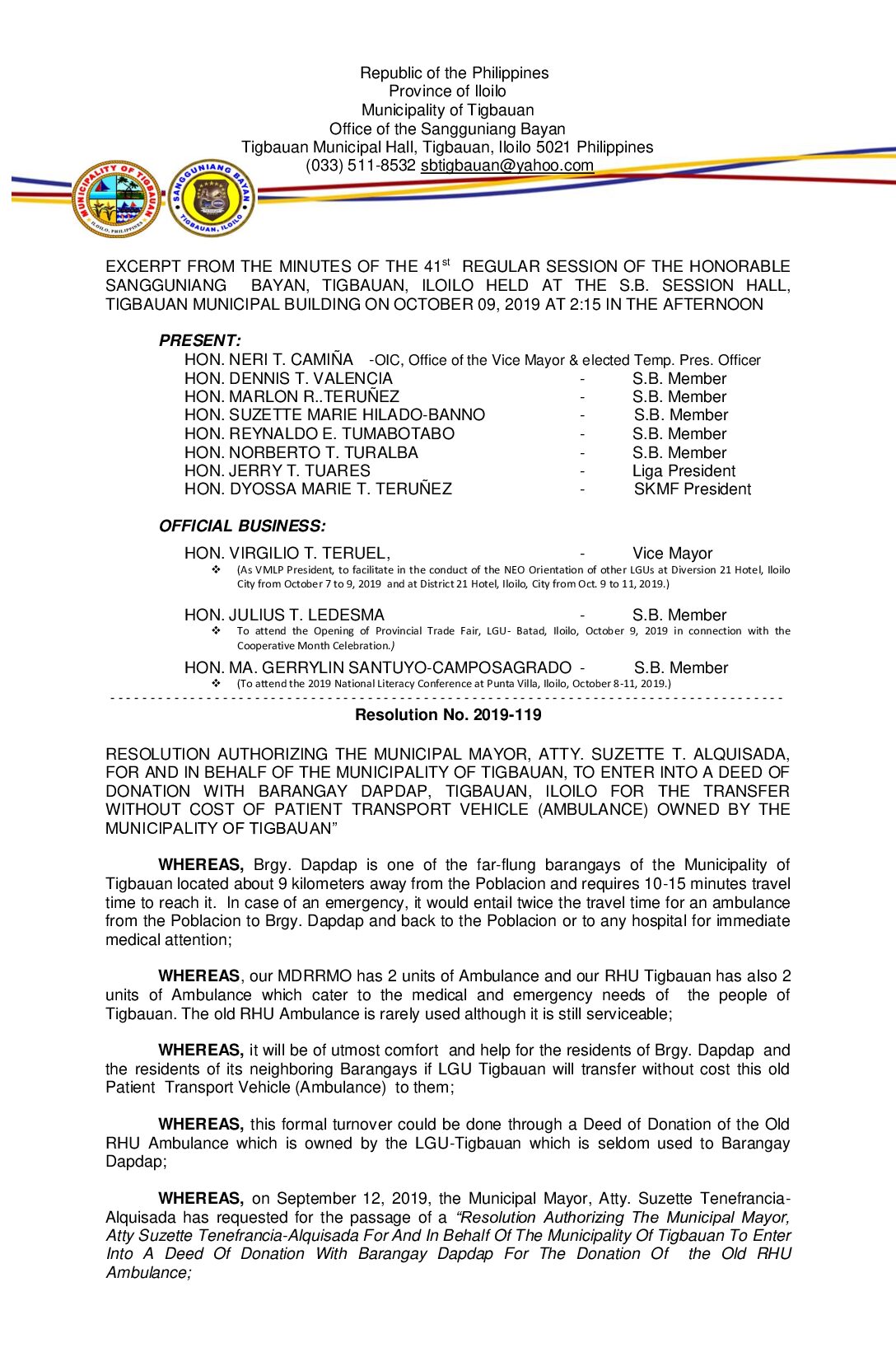 Resolution No. 2019-119 – RESOLUTION AUTHORIZING THE MUNICIPAL MAYOR, ATTY. SUZETTE T. ALQUISADA, FOR AND IN BEHALF OF THE MUNICIPALITY OF TIGBAUAN, TO ENTER INTO A DEED OF DONATION WITH BARANGAY DAPDAP, TIGBAUAN, ILOILO FOR THE TRANSFER WITHOUT COST OF PATIENT TRANSPORT VEHICLE (AMBULANCE) OWNED BY THE MUNICIPALITY OF TIGBAUAN”