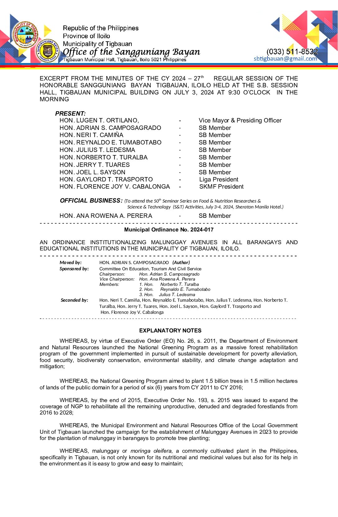 Municipal Ordinance No. 2024-017 – AN ORDINANCE INSTITUTIONALIZING MALUNGGAY AVENUES IN ALL BARANGAYS AND EDUCATIONAL INSTITUTIONS IN THE MUNICIPALITY OF TIGBAUAN, ILOILO.