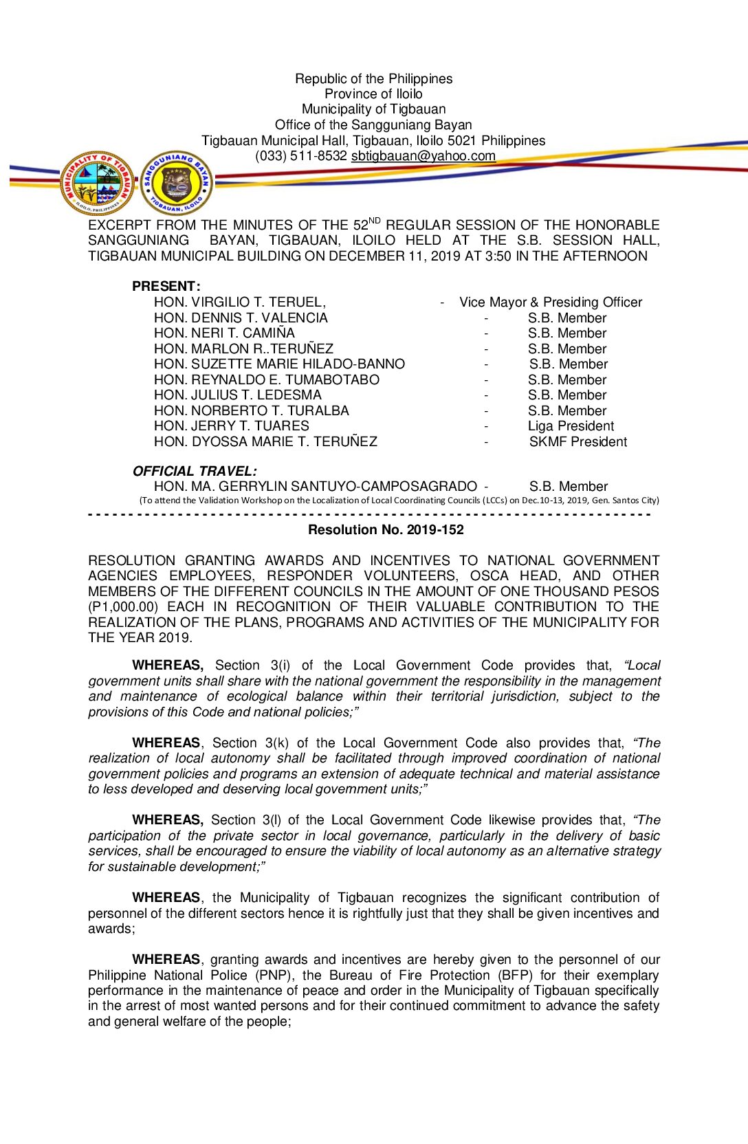 Resolution No. 2019-152 – RESOLUTION GRANTING AWARDS AND INCENTIVES TO NATIONAL GOVERNMENT AGENCIES EMPLOYEES, RESPONDER VOLUNTEERS, OSCA HEAD, AND OTHER MEMBERS OF THE DIFFERENT COUNCILS IN THE AMOUNT OF ONE THOUSAND PESOS (P1,000.00) EACH IN RECOGNITION OF THEIR VALUABLE CONTRIBUTION TO THE REALIZATION OF THE PLANS, PROGRAMS AND ACTIVITIES OF THE MUNICIPALITY FOR THE YEAR 2019.