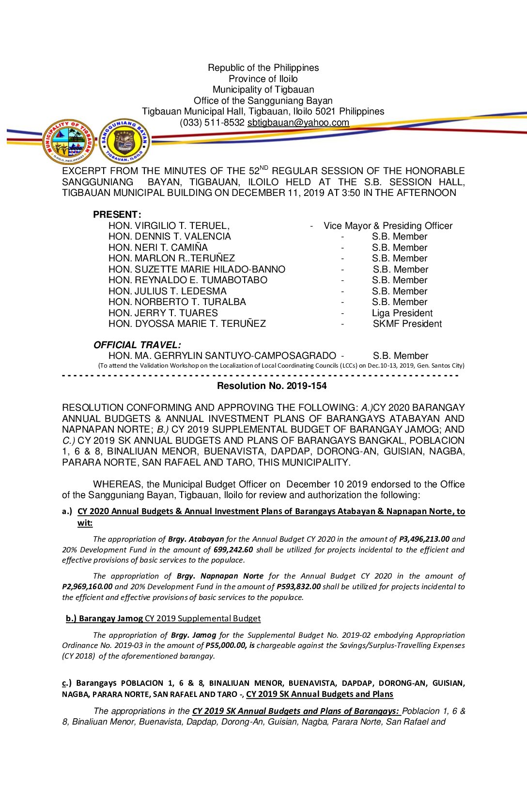 Resolution No. 2019-154 – RESOLUTION CONFORMING AND APPROVING THE FOLLOWING: A.)CY 2020 BARANGAY ANNUAL BUDGETS & ANNUAL INVESTMENT PLANS OF BARANGAYS ATABAYAN AND NAPNAPAN NORTE; B.) CY 2019 SUPPLEMENTAL BUDGET OF BARANGAY JAMOG; AND C.) CY 2019 SK ANNUAL BUDGETS AND PLANS OF BARANGAYS BANGKAL, POBLACION 1, 6 & 8, BINALIUAN MENOR, BUENAVISTA, DAPDAP, DORONG-AN, GUISIAN, NAGBA, PARARA NORTE, SAN RAFAEL AND TARO, THIS MUNICIPALITY.