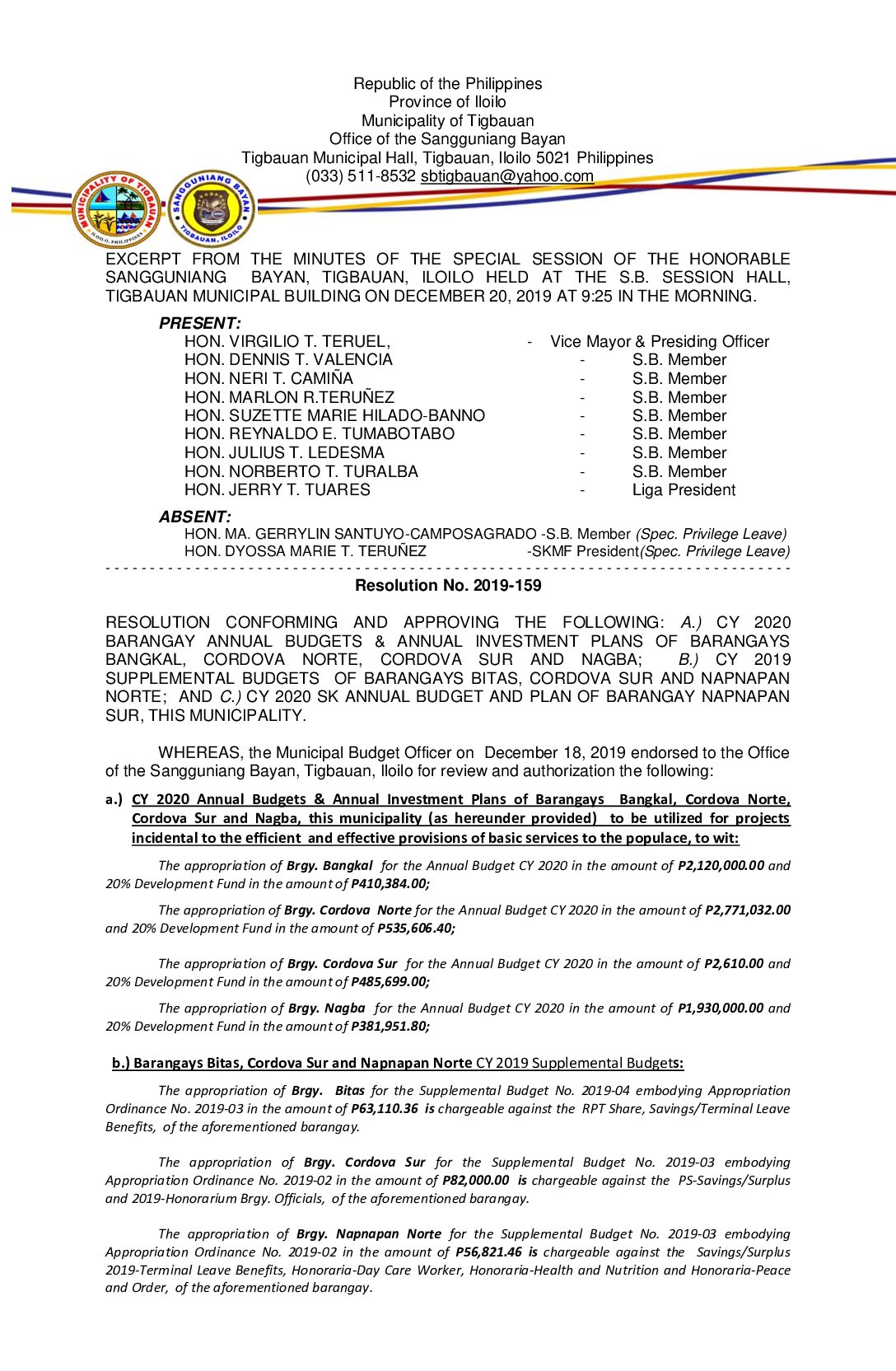 Resolution No. 2019-159 – RESOLUTION CONFORMING AND APPROVING THE FOLLOWING: A.) CY 2020 BARANGAY ANNUAL BUDGETS & ANNUAL INVESTMENT PLANS OF BARANGAYS BANGKAL, CORDOVA NORTE, CORDOVA SUR AND NAGBA; B.) CY 2019 SUPPLEMENTAL BUDGETS OF BARANGAYS BITAS, CORDOVA SUR AND NAPNAPAN NORTE; AND C.) CY 2020 SK ANNUAL BUDGET AND PLAN OF BARANGAY NAPNAPAN SUR, THIS MUNICIPALITY.