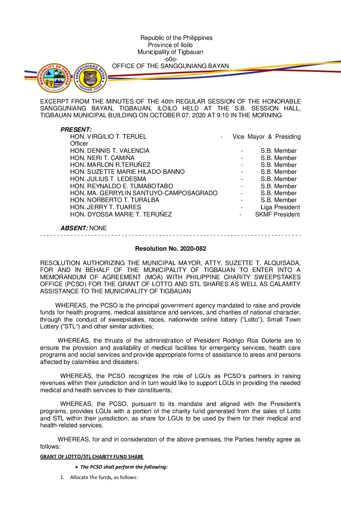 Resolution No. 2020-082 – RESOLUTION AUTHORIZING THE MUNICIPAL MAYOR, ATTY. SUZETTE T. ALQUISADA, FOR AND IN BEHALF OF THE MUNICIPALITY OF TIGBAUAN TO ENTER INTO A MEMORANDUM OF AGREEMENT (MOA) WITH PHILIPPINE CHARITY SWEEPSTAKES OFFICE (PCSO) FOR THE GRANT OF LOTTO AND STL SHARES AS WELL AS CALAMITY ASSISTANCE TO THE MUNICIPALITY OF TIGBAUAN