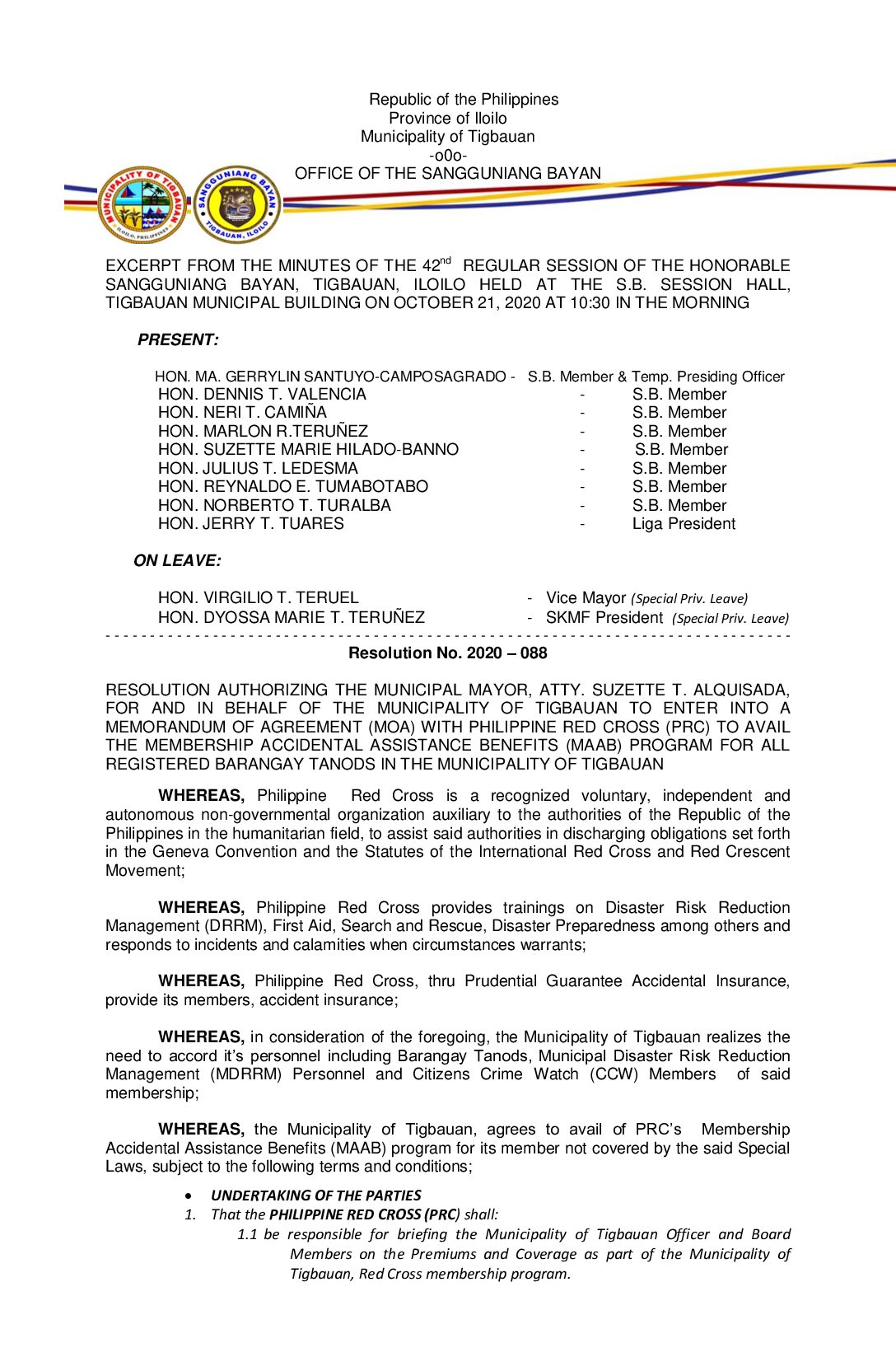 Resolution No. 2020-088 – RESOLUTION AUTHORIZING THE MUNICIPAL MAYOR, ATTY. SUZETTE T. ALQUISADA, FOR AND IN BEHALF OF THE MUNICIPALITY OF TIGBAUAN TO ENTER INTO A MEMORANDUM OF AGREEMENT (MOA) WITH PHILIPPINE RED CROSS (PRC) TO AVAIL THE MEMBERSHIP ACCIDENTAL ASSISTANCE BENEFITS (MAAB) PROGRAM FOR ALL REGISTERED BARANGAY TANODS IN THE MUNICIPALITY OF TIGBAUAN