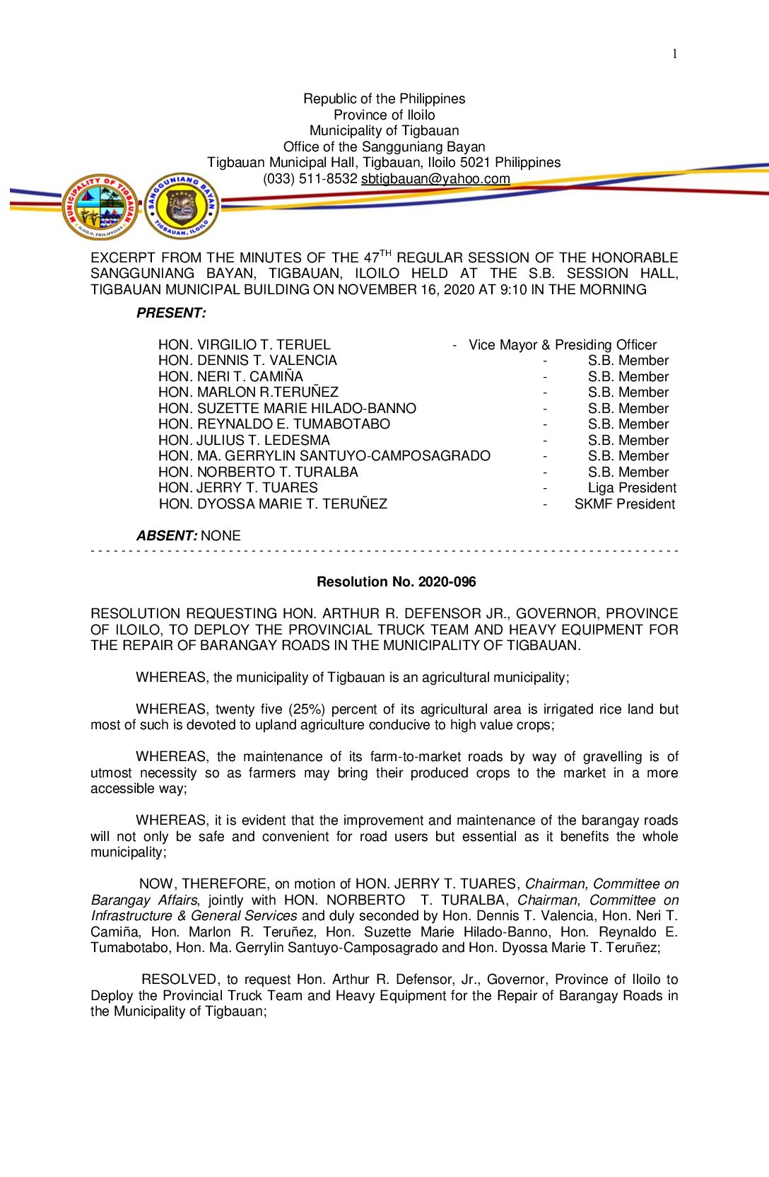 Resolution No. 2020-096 – RESOLUTION REQUESTING HON. ARTHUR R. DEFENSOR JR., GOVERNOR, PROVINCE OF ILOILO, TO DEPLOY THE PROVINCIAL TRUCK TEAM AND HEAVY EQUIPMENT FOR THE REPAIR OF BARANGAY ROADS IN THE MUNICIPALITY OF TIGBAUAN.