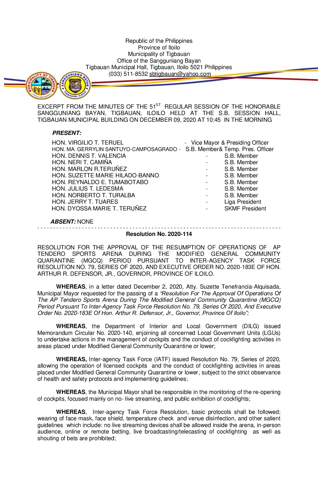 Resolution No. 2020-114 – RESOLUTION FOR THE APPROVAL OF THE RESUMPTION OF OPERATIONS OF AP TENDERO SPORTS ARENA DURING THE MODIFIED GENERAL COMMUNITY QUARANTINE (MGCQ) PERIOD PURSUANT TO INTER-AGENCY TASK FORCE RESOLUTION NO. 79, SERIES OF 2020, AND EXECUTIVE ORDER NO. 2020-183E OF HON. ARTHUR R. DEFENSOR, JR., GOVERNOR, PROVINCE OF ILOILO.