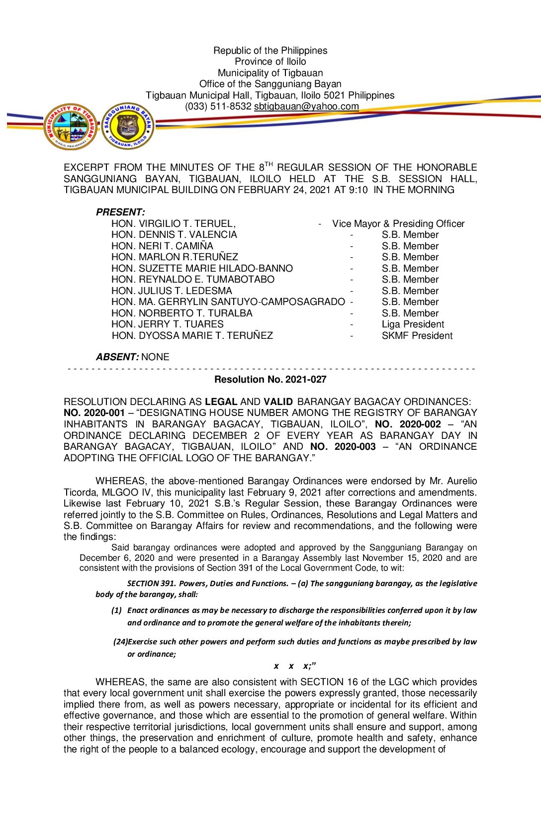Resolution No. 2021-027 – RESOLUTION DECLARING AS LEGAL AND VALID BARANGAY BAGACAY ORDINANCES: NO. 2020-001 – “DESIGNATING HOUSE NUMBER AMONG THE REGISTRY OF BARANGAY INHABITANTS IN BARANGAY BAGACAY, TIGBAUAN, ILOILO”, NO. 2020-002 – “AN ORDINANCE DECLARING DECEMBER 2 OF EVERY YEAR AS BARANGAY DAY IN BARANGAY BAGACAY, TIGBAUAN, ILOILO” AND NO. 2020-003 – “AN ORDINANCE ADOPTING THE OFFICIAL LOGO OF THE BARANGAY.”