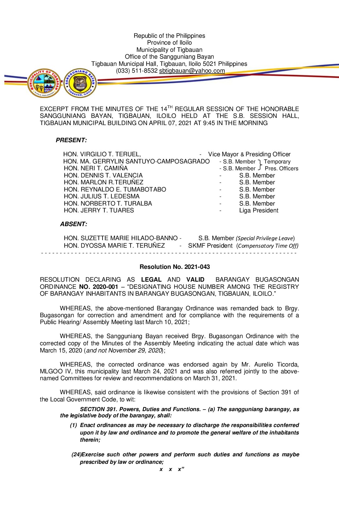 Resolution No. 2021-043 – RESOLUTION DECLARING AS LEGAL AND VALID BARANGAY BUGASONGAN ORDINANCE NO. 2020-001 – “DESIGNATING HOUSE NUMBER AMONG THE REGISTRY OF BARANGAY INHABITANTS IN BARANGAY BUGASONGAN, TIGBAUAN, ILOILO.”