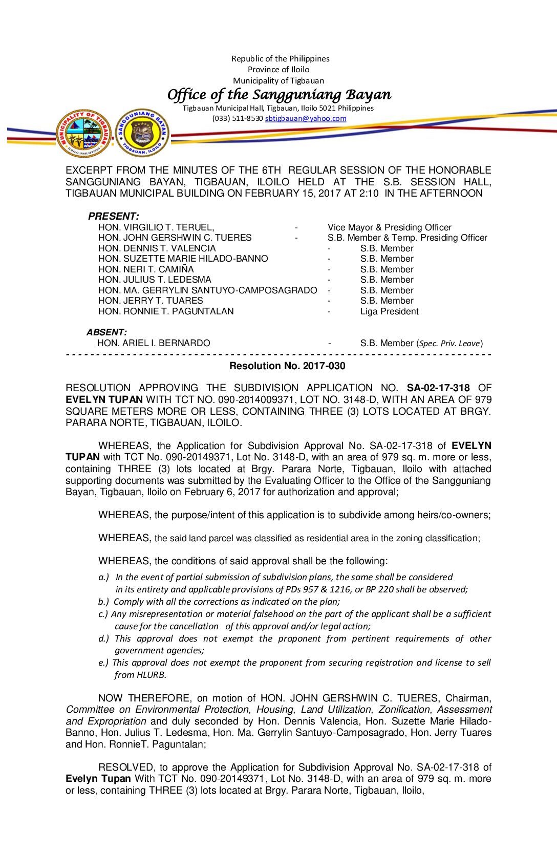 Resolution No. 2017-030 – RESOLUTION APPROVING THE SUBDIVISION APPLICATION NO. SA-02-17-318 OF EVELYN TUPAN WITH TCT NO. 090-2014009371, LOT NO. 3148-D, WITH AN AREA OF 979 SQUARE METERS MORE OR LESS, CONTAINING THREE (3) LOTS LOCATED AT BRGY. PARARA NORTE, TIGBAUAN, ILOILO.