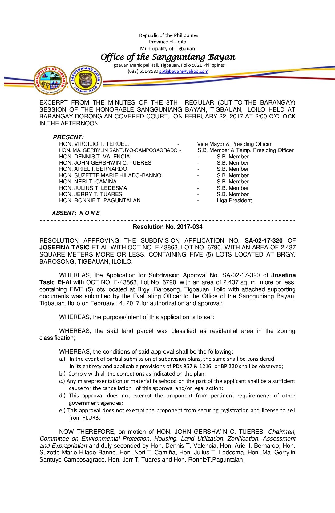 Resolution No. 2017-034 – RESOLUTION APPROVING THE SUBDIVISION APPLICATION NO. SA-02-17-320 OF JOSEFINA TASIC ET-AL WITH OCT NO. F-43863, LOT NO. 6790, WITH AN AREA OF 2,437 SQUARE METERS MORE OR LESS, CONTAINING FIVE (5) LOTS LOCATED AT BRGY. BAROSONG, TIGBAUAN, ILOILO.