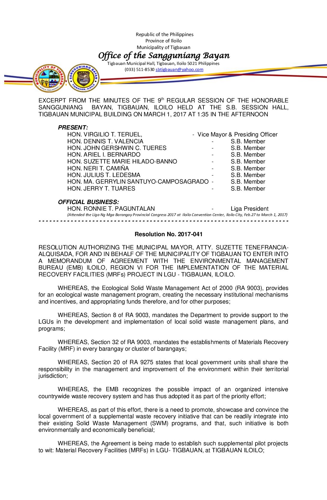 Resolution No. 2017-041 – RESOLUTION AUTHORIZING THE MUNICIPAL MAYOR, ATTY. SUZETTE TENEFRANCIA- ALQUISADA, FOR AND IN BEHALF OF THE MUNICIPALITY OF TIGBAUAN TO ENTER INTO A MEMORANDUM OF AGREEMENT WITH THE ENVIRONMENTAL MANAGEMENT BUREAU (EMB) ILOILO, REGION VI FOR THE IMPLEMENTATION OF THE MATERIAL RECOVERY FACILITIES (MRFs) PROJECT IN LGU – TIGBAUAN, ILOILO.
