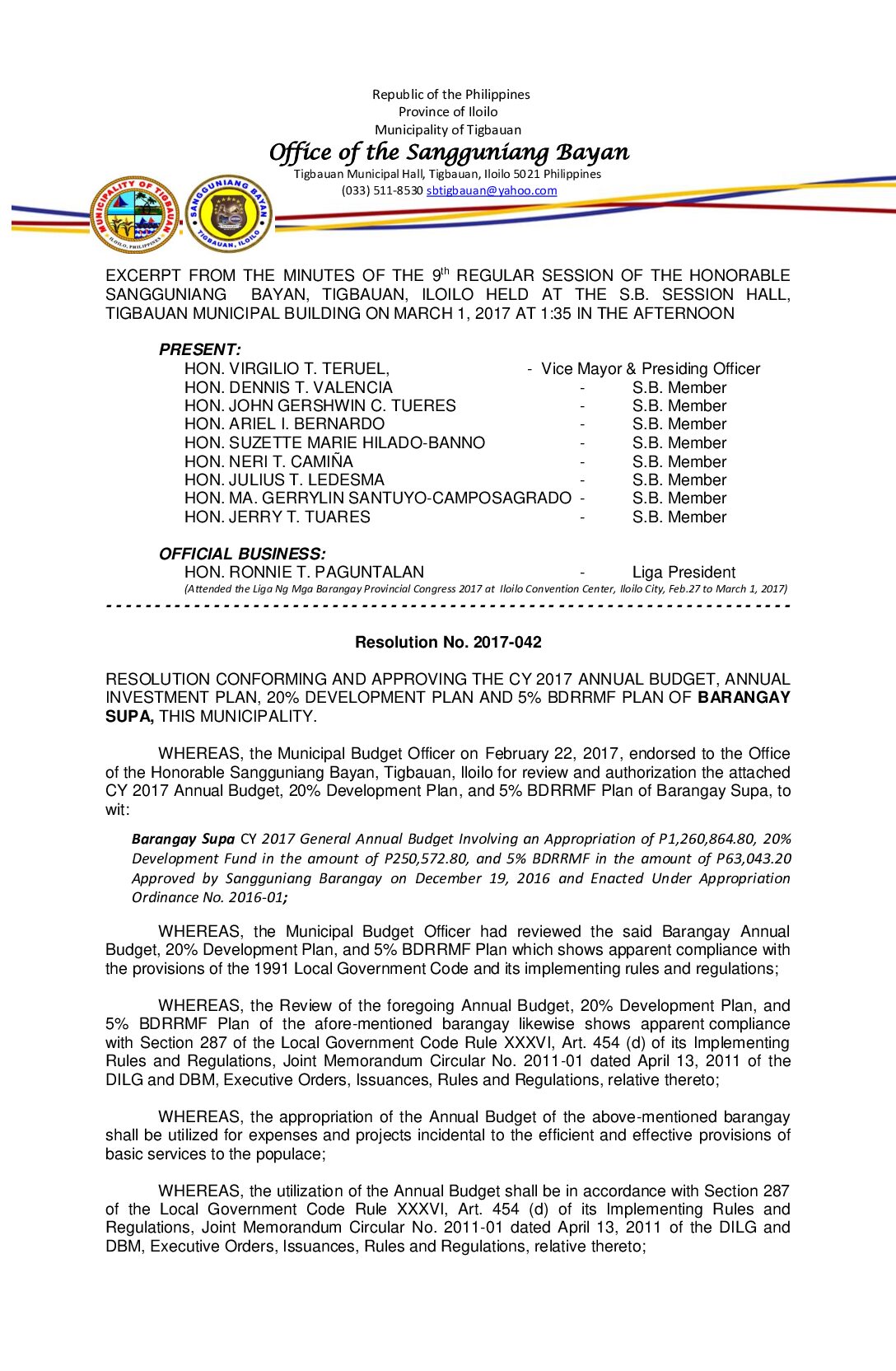 Resolution No. 2017-042 – RESOLUTION CONFORMING AND APPROVING THE CY 2017 ANNUAL BUDGET, ANNUAL INVESTMENT PLAN, 20% DEVELOPMENT PLAN AND 5% BDRRMF PLAN OF BARANGAY SUPA, THIS MUNICIPALITY.