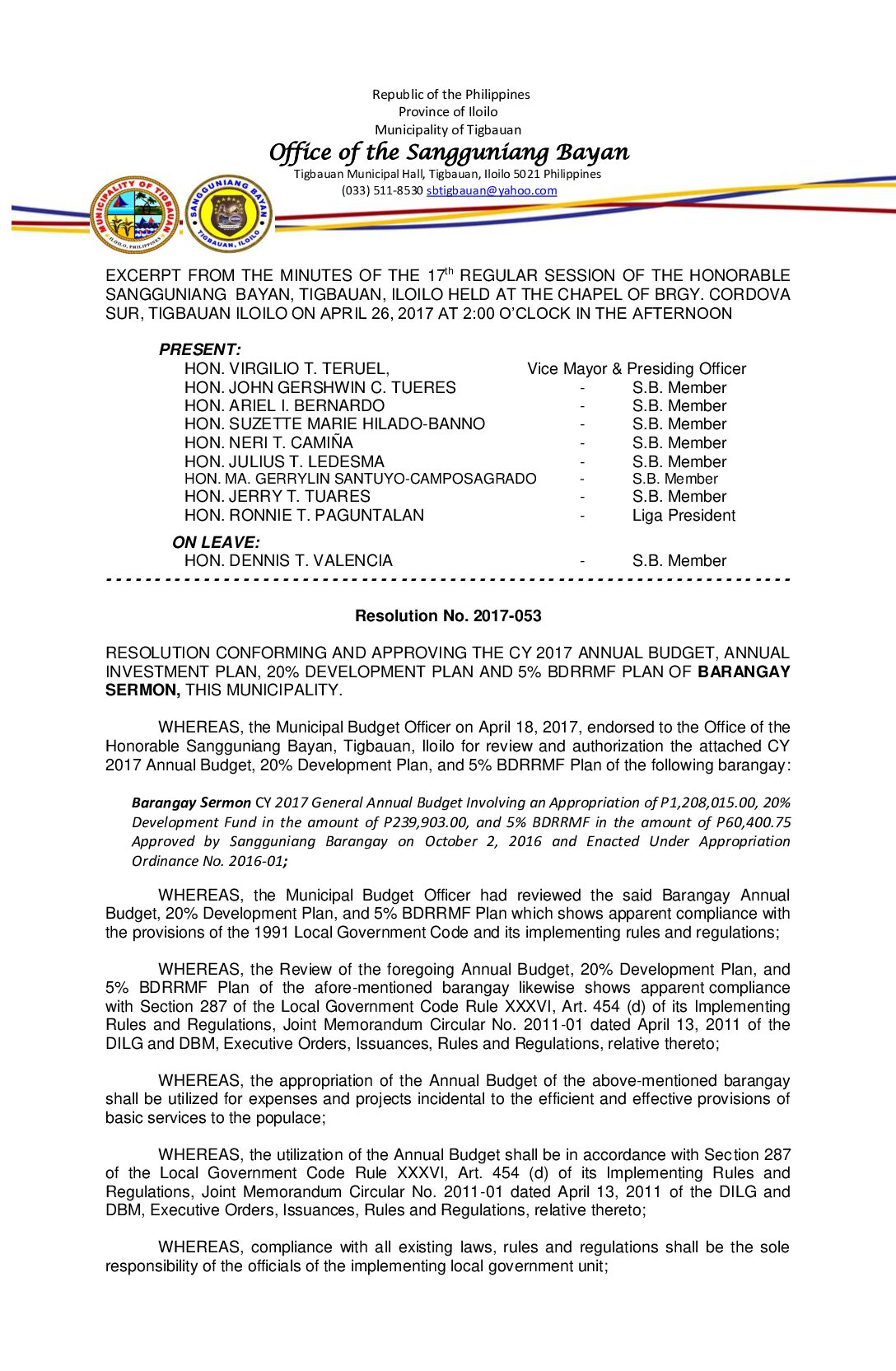Resolution No. 2017-053 – RESOLUTION CONFORMING AND APPROVING THE CY 2017 ANNUAL BUDGET, ANNUAL INVESTMENT PLAN, 20% DEVELOPMENT PLAN AND 5% BDRRMF PLAN OF BARANGAY SERMON, THIS MUNICIPALITY.