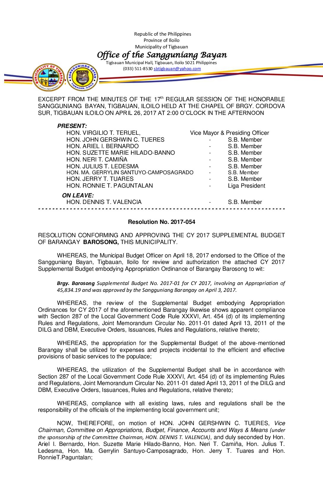 Resolution No. 2017-054 – RESOLUTION CONFORMING AND APPROVING THE CY 2017 SUPPLEMENTAL BUDGET OF BARANGAY BAROSONG, THIS MUNICIPALITY.