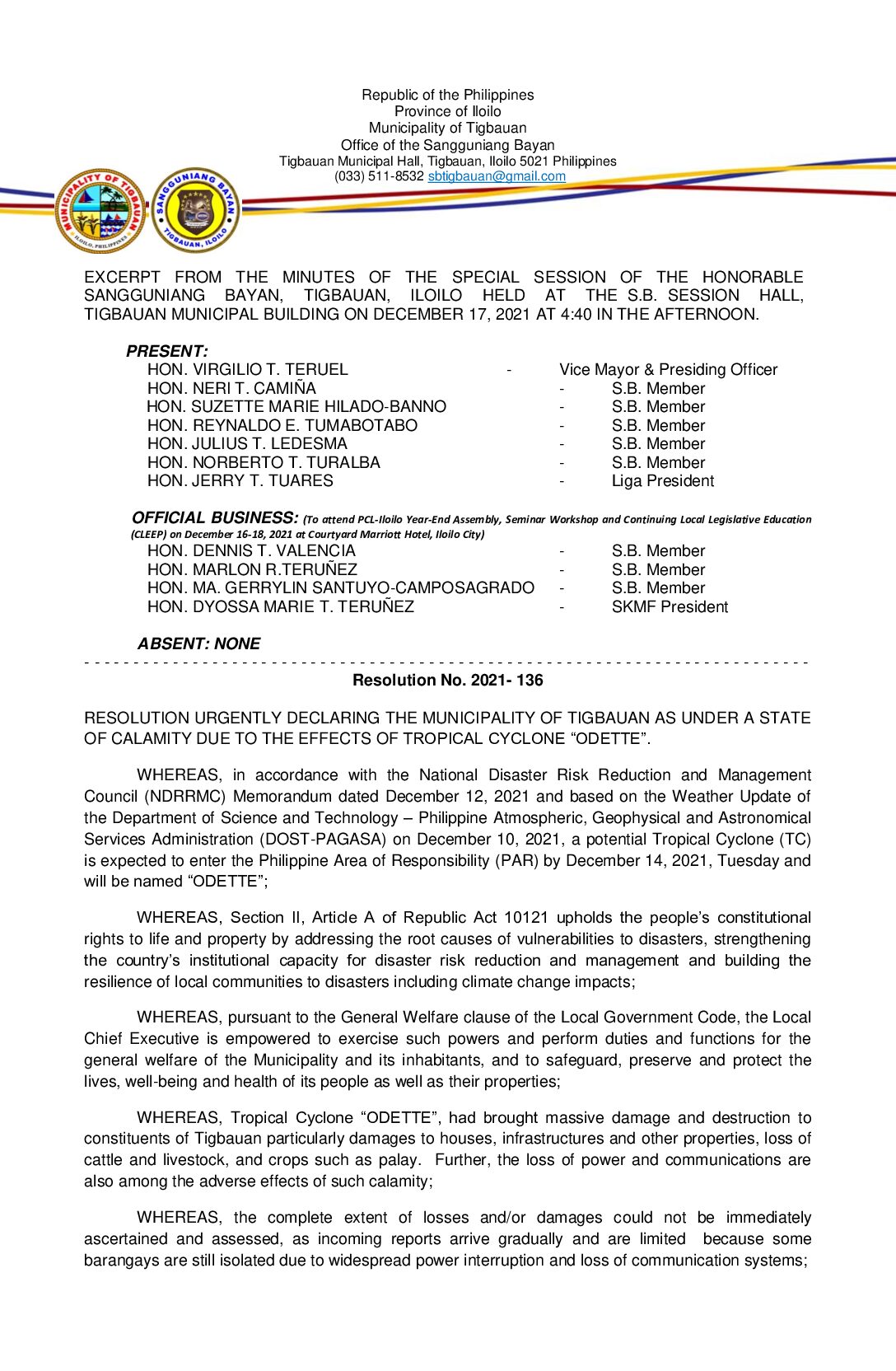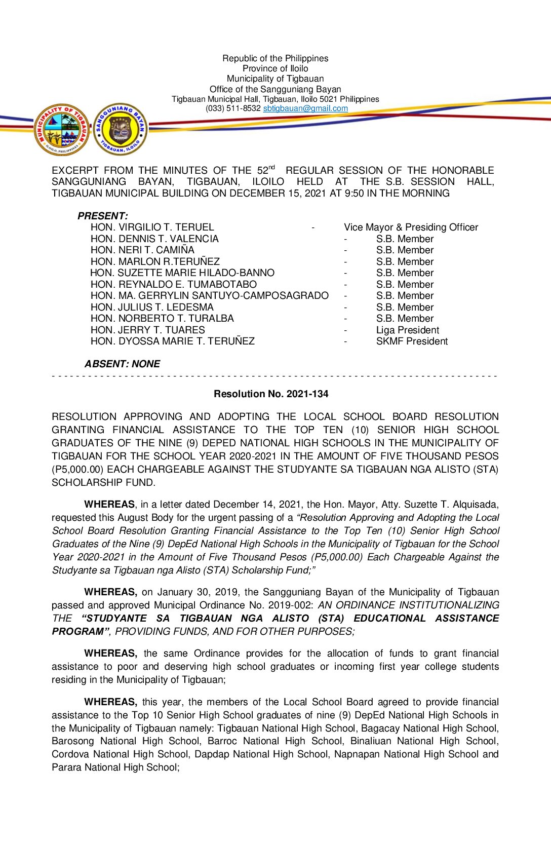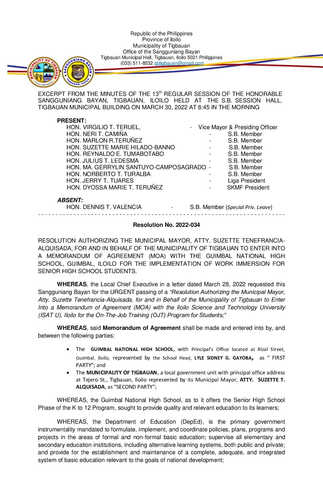 Resolution No. 2022-034 – RESOLUTION AUTHORIZING THE MUNICIPAL MAYOR, ATTY. SUZETTE TENEFRANCIAALQUISADA, FOR AND IN BEHALF OF THE MUNICIPALITY OF TIGBAUAN TO ENTER INTO A MEMORANDUM OF AGREEMENT (MOA) WITH THE GUIMBAL NATIONAL HIGH SCHOOL, GUIMBAL, ILOILO FOR THE IMPLEMENTATION OF WORK IMMERSION FOR SENIOR HIGH SCHOOL STUDENTS.