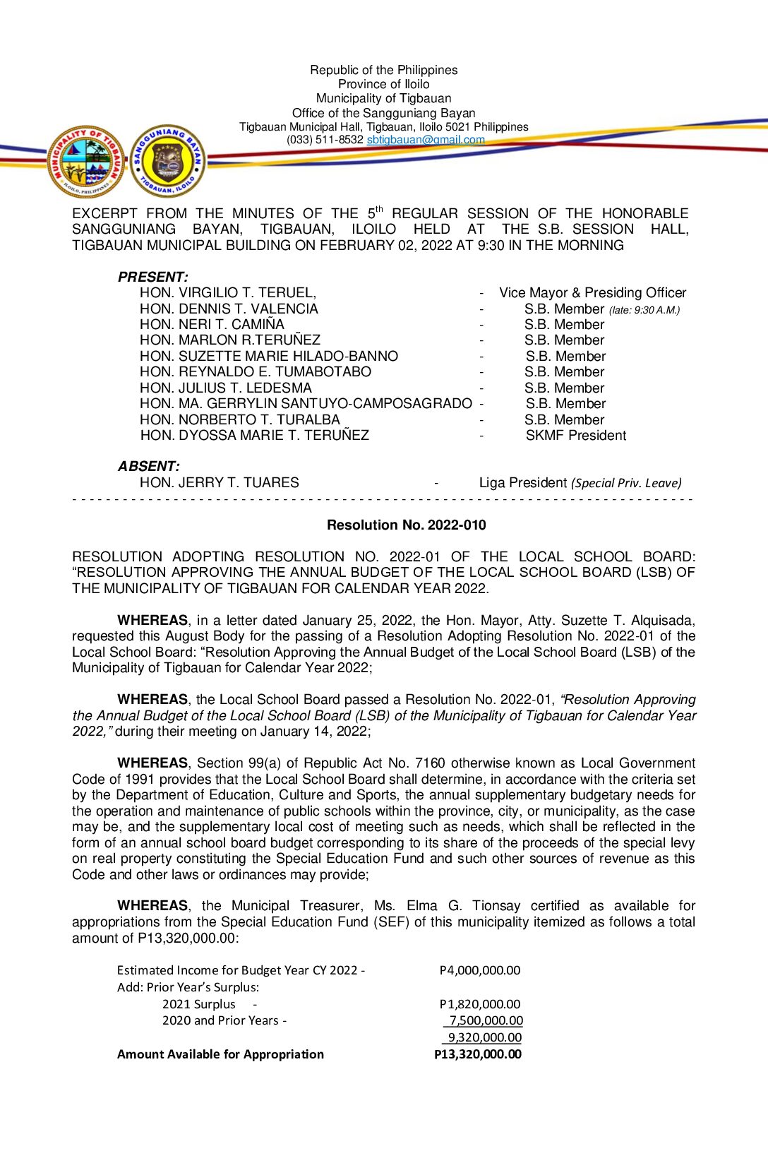 Resolution No. 2022-010 – RESOLUTION AUTHORIZING THE MUNICIPAL MAYOR, ATTY. VIRGILIO T. TERUEL, FOR AND IN BEHALF OF THE MUNICIPALITY OF TIGBAUAN TO ENTER INTO A MEMORANDUM OF AGREEMENT (MOA) WITH THE WEST VISAYAS STATE UNIVERSITY (WVSU), LA PAZ, ILOILO CITY FOR THE IMPLEMENTATION OF ON-THE-JOB TRAINING (OJT) PROGRAM.
