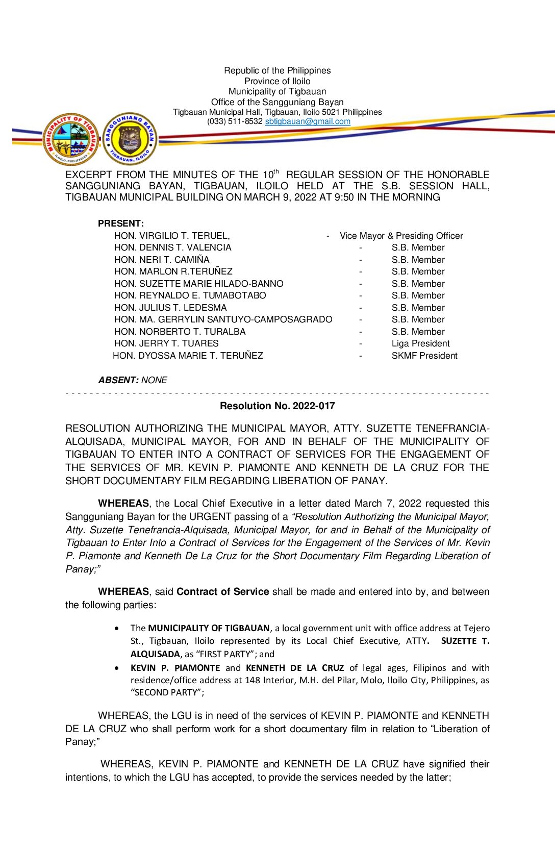 Resolution No. 2022-017 – RESOLUTION AUTHORIZING THE MUNICIPAL MAYOR, ATTY. SUZETTE TENEFRANCIAALQUISADA, MUNICIPAL MAYOR, FOR AND IN BEHALF OF THE MUNICIPALITY OF TIGBAUAN TO ENTER INTO A CONTRACT OF SERVICES FOR THE ENGAGEMENT OF THE SERVICES OF MR. KEVIN P. PIAMONTE AND KENNETH DE LA CRUZ FOR THE SHORT DOCUMENTARY FILM REGARDING LIBERATION OF PANAY.