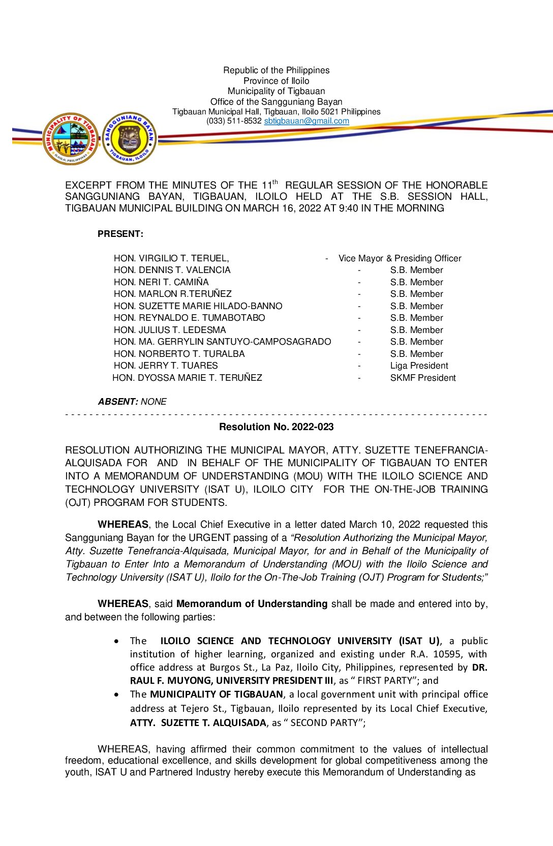 Resolution No. 2022-023 – RESOLUTION AUTHORIZING THE MUNICIPAL MAYOR, ATTY. SUZETTE TENEFRANCIAALQUISADA FOR AND IN BEHALF OF THE MUNICIPALITY OF TIGBAUAN TO ENTER INTO A MEMORANDUM OF UNDERSTANDING (MOU) WITH THE ILOILO SCIENCE AND TECHNOLOGY UNIVERSITY (ISAT U), ILOILO CITY FOR THE ON-THE-JOB TRAINING (OJT) PROGRAM FOR STUDENTS.