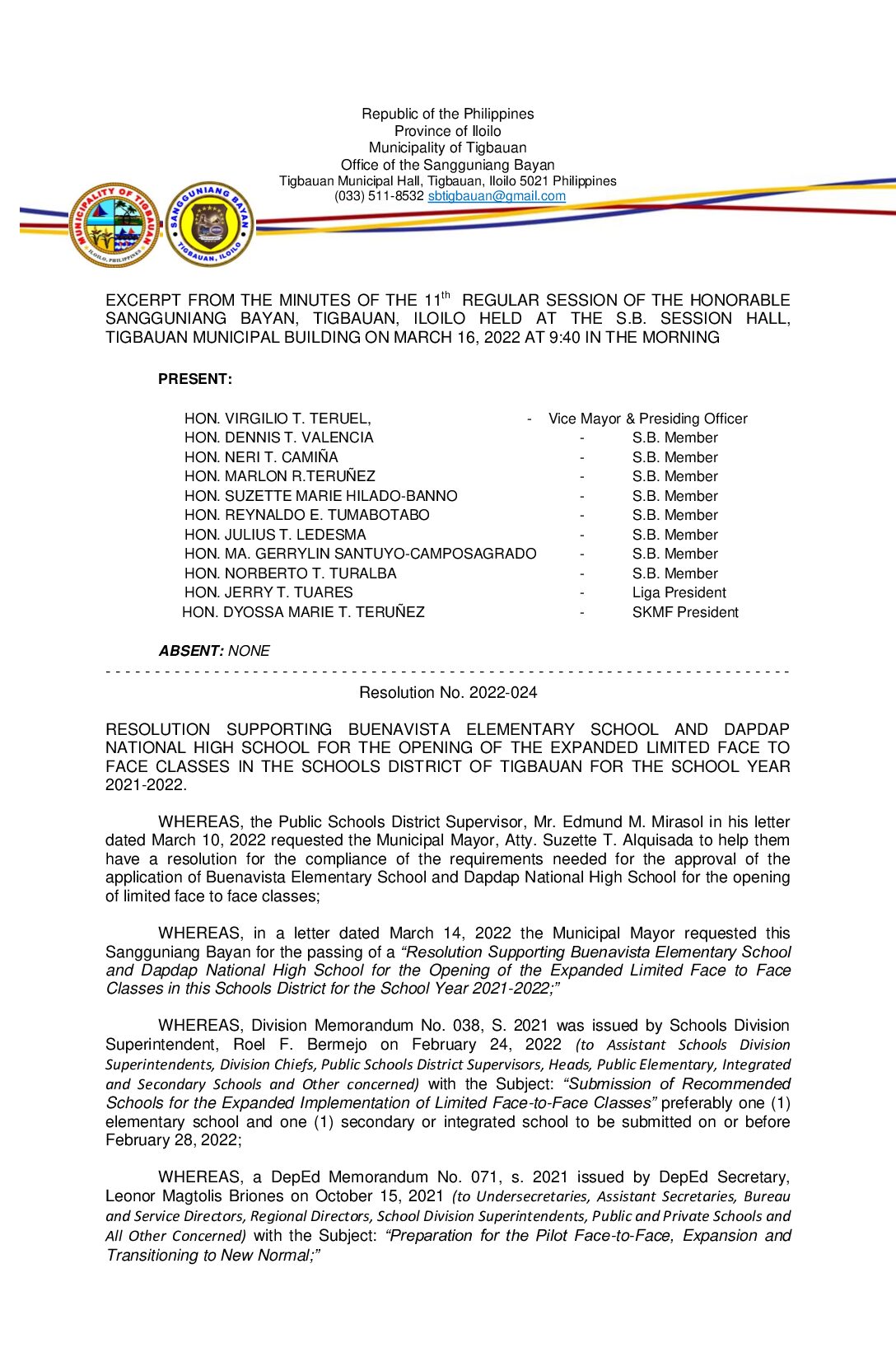 Resolution No. 2022-024 – RESOLUTION SUPPORTING BUENAVISTA ELEMENTARY SCHOOL AND DAPDAP NATIONAL HIGH SCHOOL FOR THE OPENING OF THE EXPANDED LIMITED FACE TO FACE CLASSES IN THE SCHOOLS DISTRICT OF TIGBAUAN FOR THE SCHOOL YEAR 2021-2022.