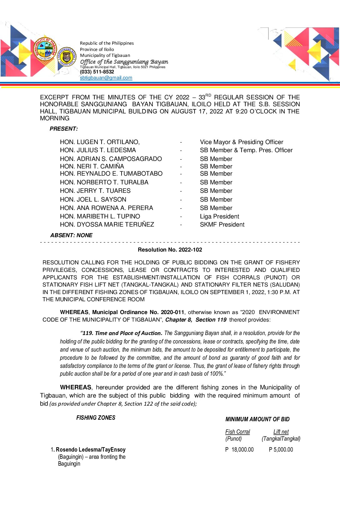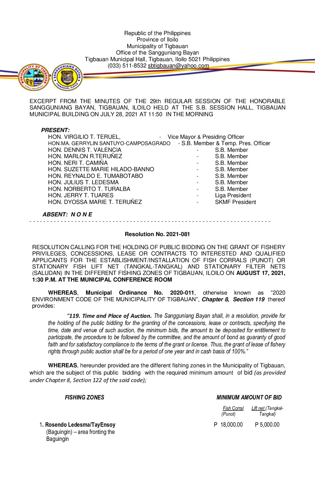 Resolution No. 2021-081 – RESOLUTION CALLING FOR THE HOLDING OF PUBLIC BIDDING ON THE GRANT OF FISHERY PRIVILEGES, CONCESSIONS, LEASE OR CONTRACTS TO INTERESTED AND QUALIFIED APPLICANTS FOR THE ESTABLISHMENT/INSTALLATION OF FISH CORRALS (PUNOT) OR STATIONARY FISH LIFT NET (TANGKAL-TANGKAL) AND STATIONARY FILTER NETS (SALUDAN) IN THE DIFFERENT FISHING ZONES OF TIGBAUAN, ILOILO ON AUGUST 17, 2021, 1:30 P.M. AT THE MUNICIPAL CONFERENCE ROOM