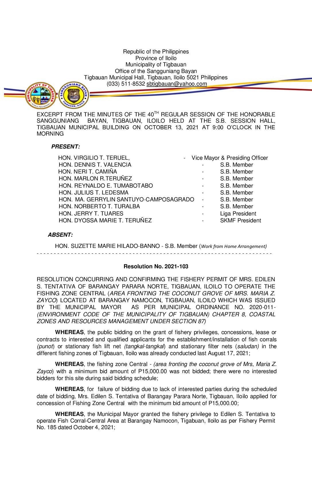Resolution No. 2021-103 – RESOLUTION CONCURRING AND CONFIRMING THE FISHERY PERMIT OF MRS. EDILEN S. TENTATIVA OF BARANGAY PARARA NORTE, TIGBAUAN, ILOILO TO OPERATE THE FISHING ZONE CENTRAL (AREA FRONTING THE COCONUT GROVE OF MRS. MARIA Z. ZAYCO) LOCATED AT BARANGAY NAMOCON, TIGBAUAN, ILOILO WHICH WAS ISSUED BY THE MUNICIPAL MAYOR AS PER MUNICIPAL ORDINANCE NO. 2020-011- (ENVIRONMENT CODE OF THE MUNICIPALITY OF TIGBAUAN) CHAPTER 8, COASTAL ZONES AND RESOURCES MANAGEMENT UNDER SECTION 87)