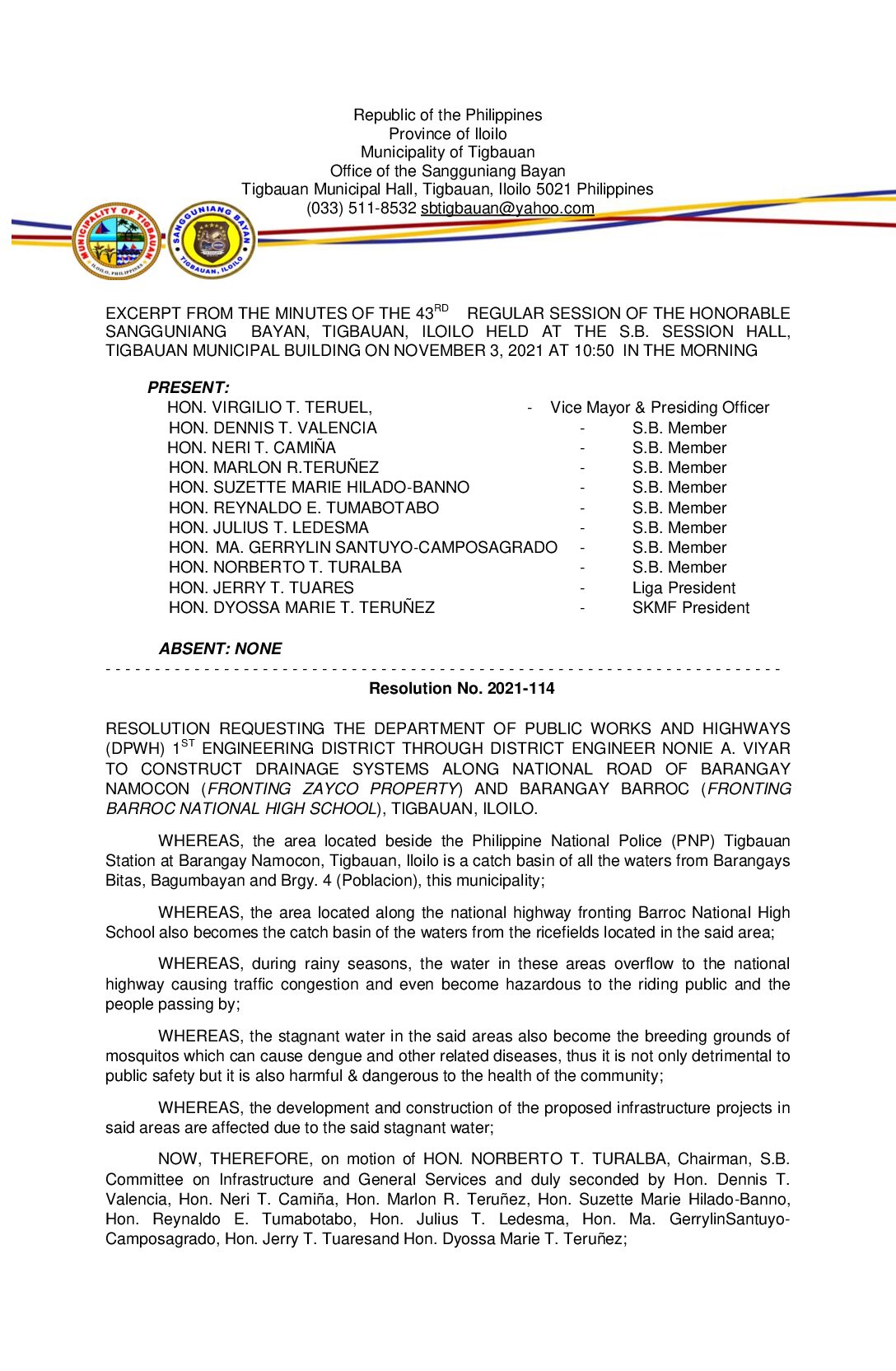 Resolution No. 2021-114 – RESOLUTION REQUESTING THE DEPARTMENT OF PUBLIC WORKS AND HIGHWAYS (DPWH) 1ST ENGINEERING DISTRICT THROUGH DISTRICT ENGINEER NONIE A. VIYAR TO CONSTRUCT DRAINAGE SYSTEMS ALONG NATIONAL ROAD OF BARANGAY NAMOCON (FRONTING ZAYCO PROPERTY) AND BARANGAY BARROC (FRONTING BARROC NATIONAL HIGH SCHOOL), TIGBAUAN, ILOILO.