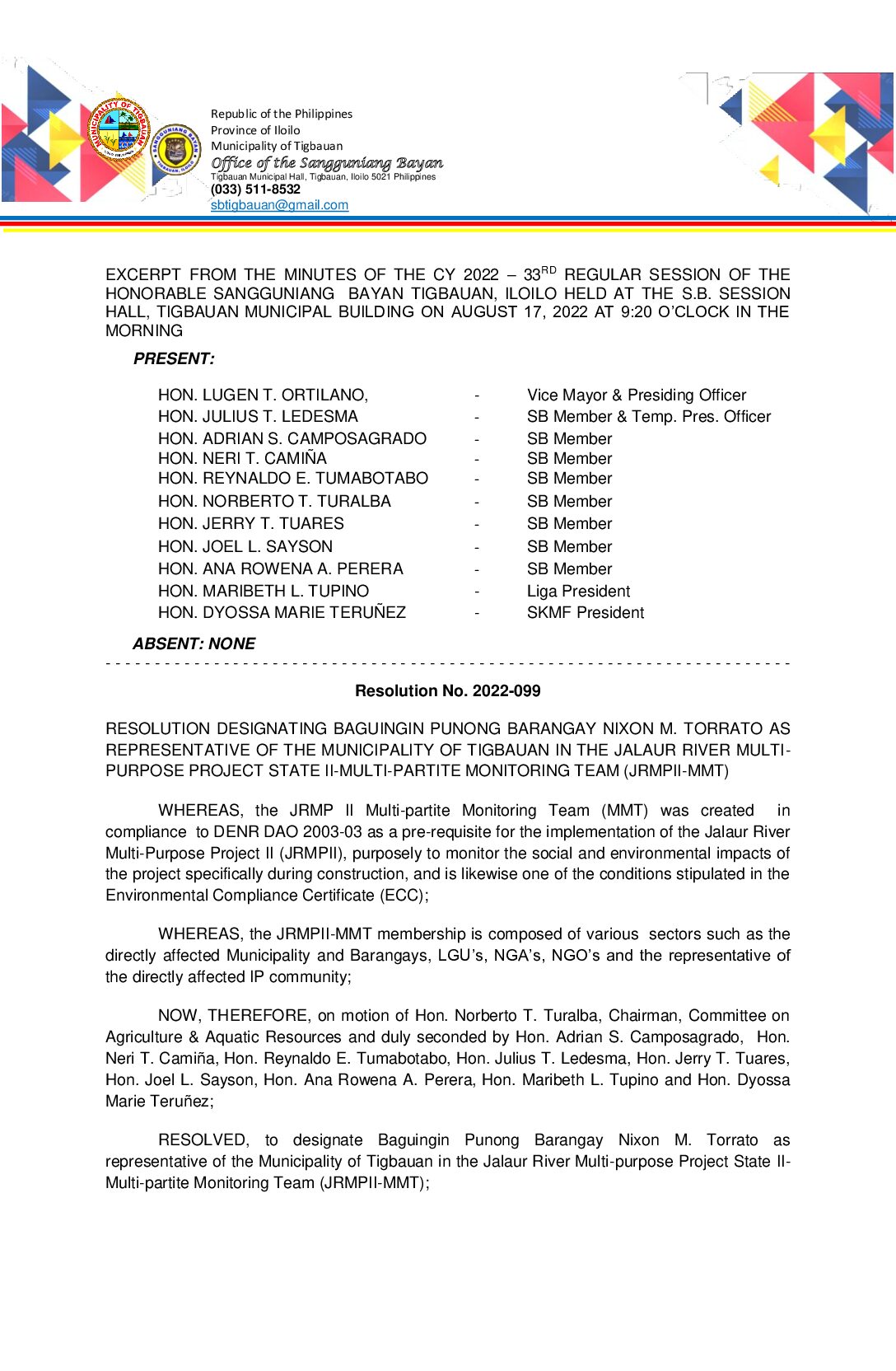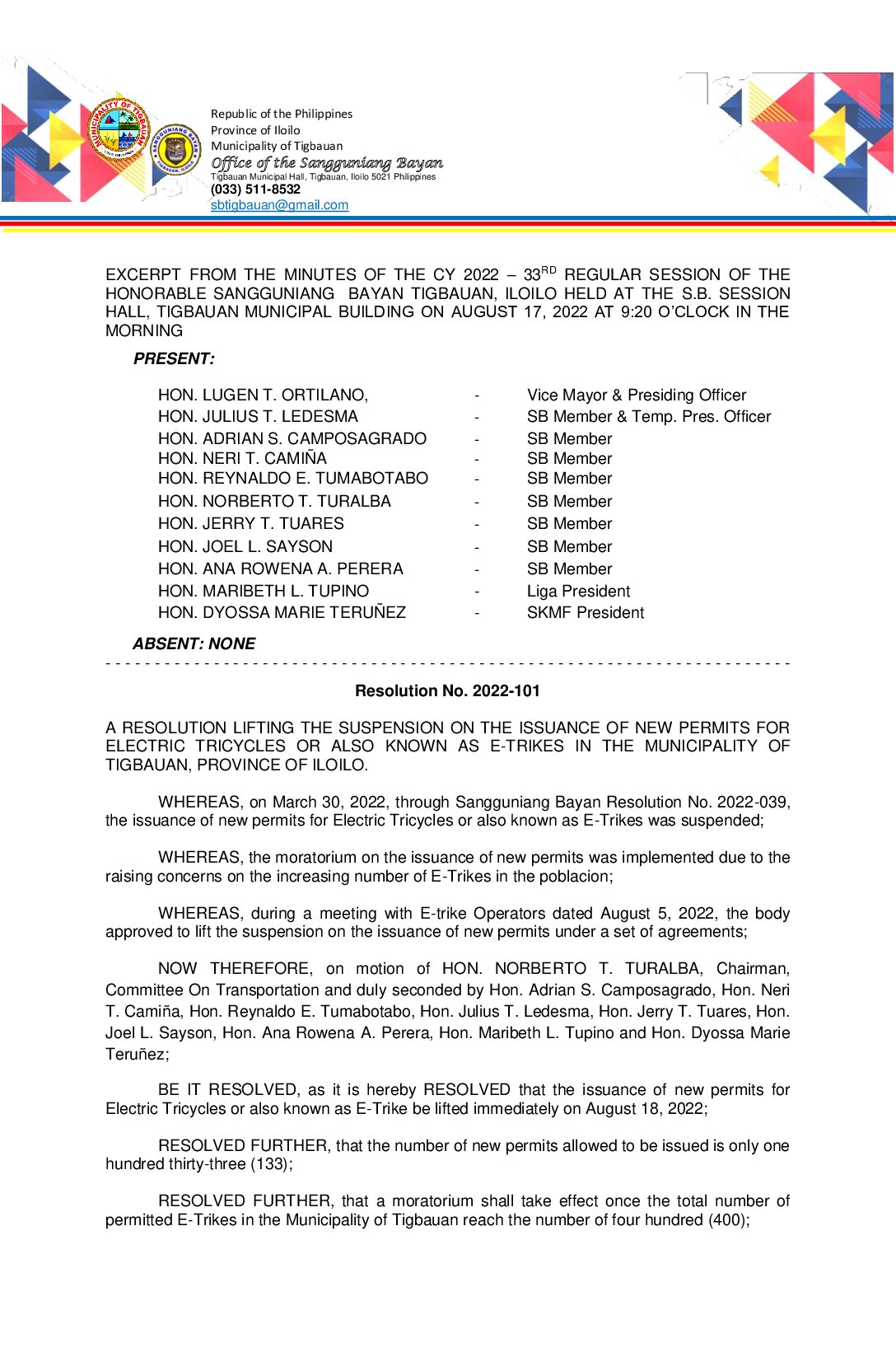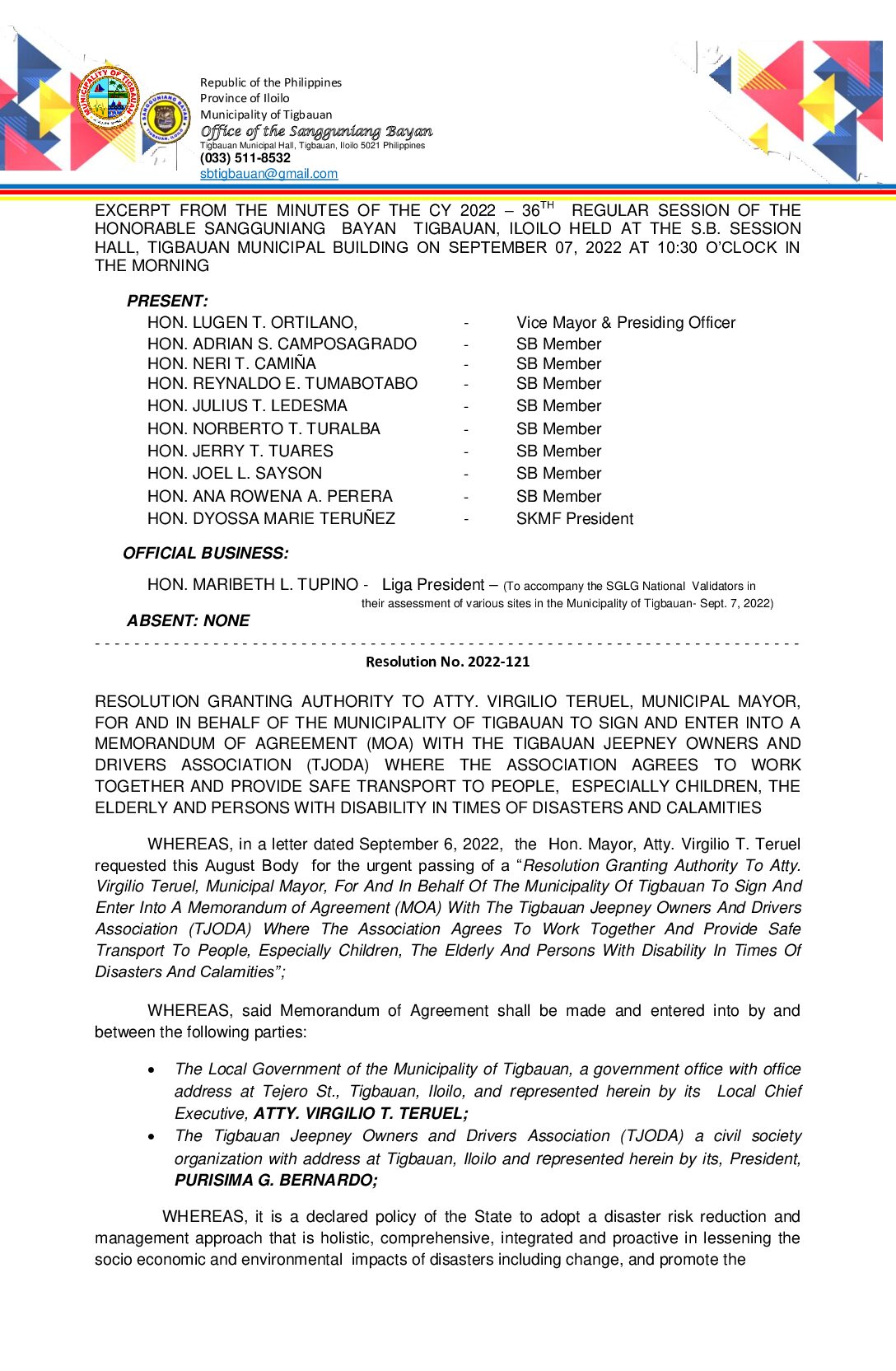 Resolution No. 2022-121 – RESOLUTION GRANTING AUTHORITY TO ATTY. VIRGILIO TERUEL, MUNICIPAL MAYOR, FOR AND IN BEHALF OF THE MUNICIPALITY OF TIGBAUAN TO SIGN AND ENTER INTO A MEMORANDUM OF AGREEMENT (MOA) WITH THE TIGBAUAN JEEPNEY OWNERS AND DRIVERS ASSOCIATION (TJODA) WHERE THE ASSOCIATION AGREES TO WORK TOGETHER AND PROVIDE SAFE TRANSPORT TO PEOPLE, ESPECIALLY CHILDREN, THE ELDERLY AND PERSONS WITH DISABILITY IN TIMES OF DISASTER AND CALAMITIES