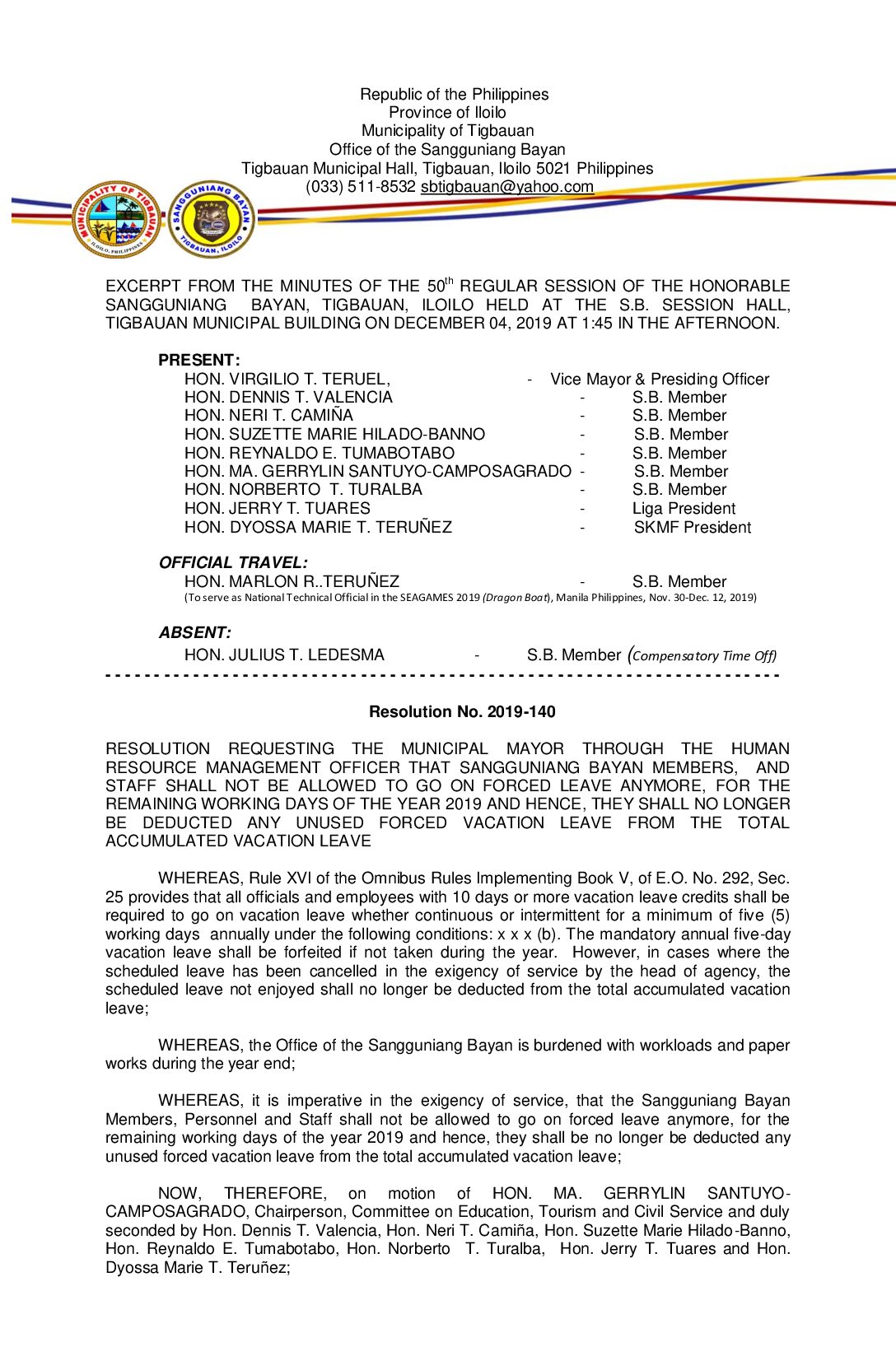 Resolution No. 2019-140 -RESOLUTION REQUESTING THE MUNICIPAL MAYOR THROUGH THE HUMAN RESOURCE MANAGEMENT OFFICER THAT SANGGUNIANG BAYAN MEMBERS, AND STAFF SHALL NOT BE ALLOWED TO GO ON FORCED LEAVE ANYMORE, FOR THE REMAINING WORKING DAYS OF THE YEAR 2019 AND HENCE, THEY SHALL NO LONGER BE DEDUCTED ANY UNUSED FORCED VACATION LEAVE FROM THE TOTAL ACCUMULATED VACATION LEAVE