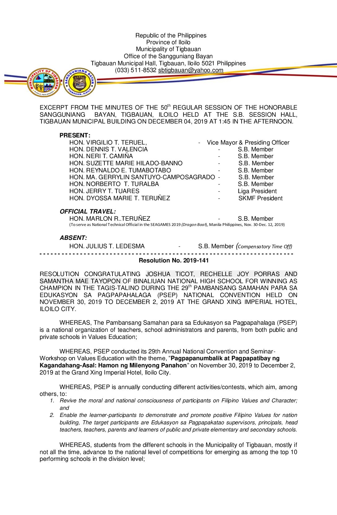 Resolution No. 2019-141 – RESOLUTION CONGRATULATING JOSHUA TICOT, RECHELLE JOY PORRAS AND SAMANTHA MAE TAYOPON OF BINALIUAN NATIONAL HIGH SCHOOL FOR WINNING AS CHAMPION IN THE TAGIS-TALINO DURING THE 29th PAMBANSANG SAMAHAN PARA SA EDUKASYON SA PAGPAPAHALAGA (PSEP) NATIONAL CONVENTION HELD ON NOVEMBER 30, 2019 TO DECEMBER 2, 2019 AT THE GRAND XING IMPERIAL HOTEL, ILOILO CITY.