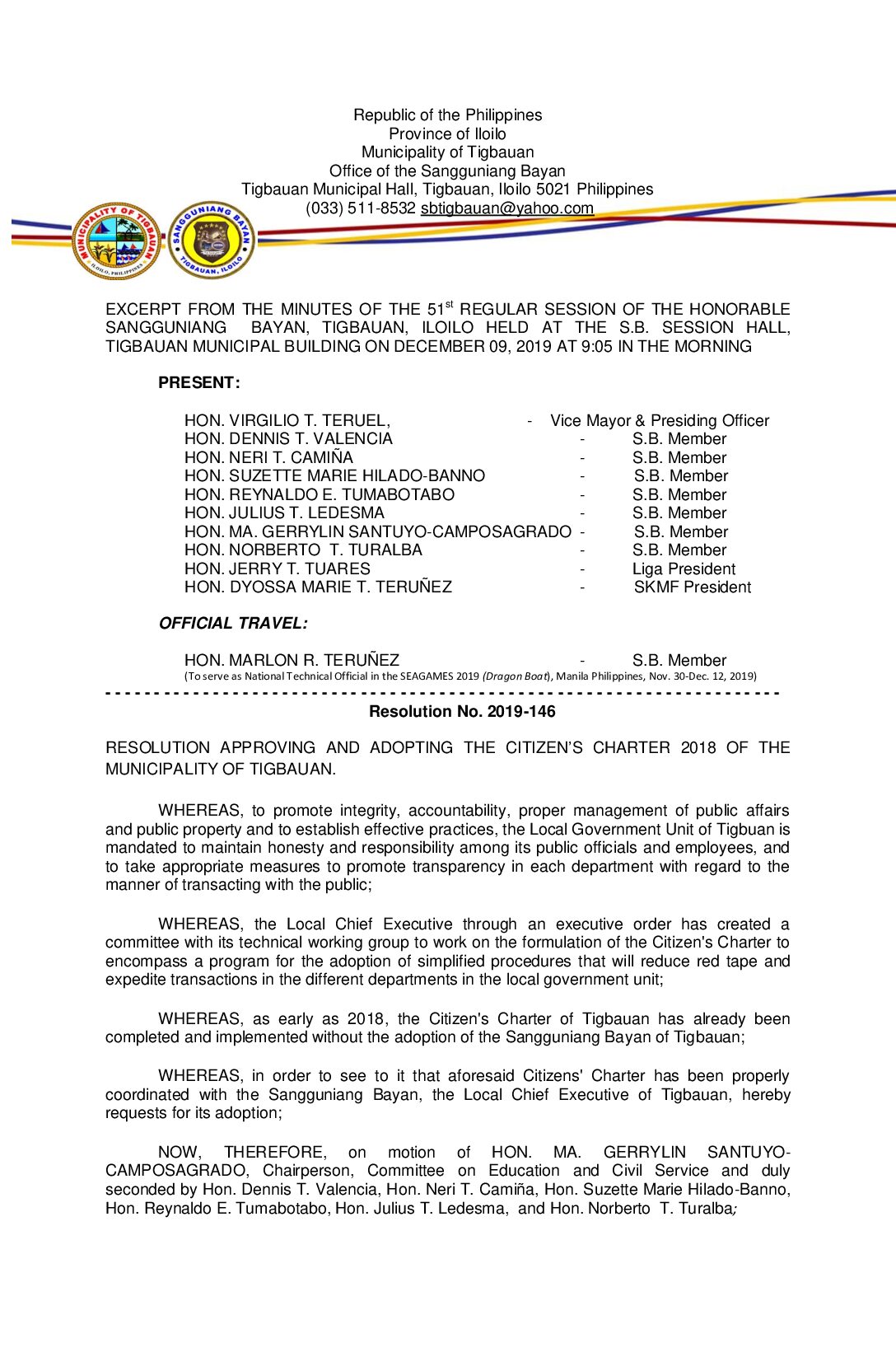 Resolution No. 2019-146 – RESOLUTION APPROVING AND ADOPTING THE CITIZEN’S CHARTER 2018 OF THE MUNICIPALITY OF TIGBAUAN.