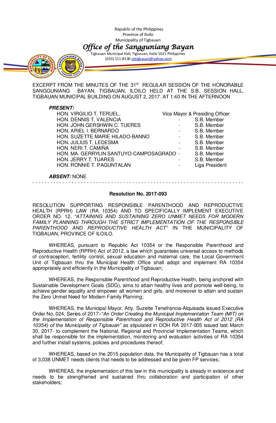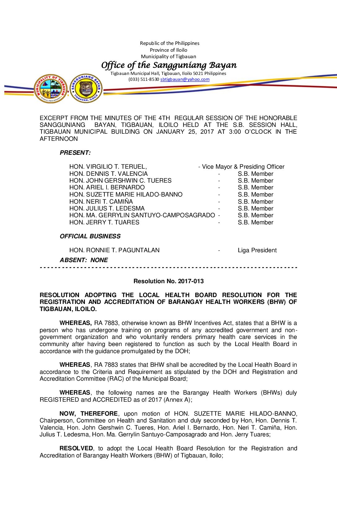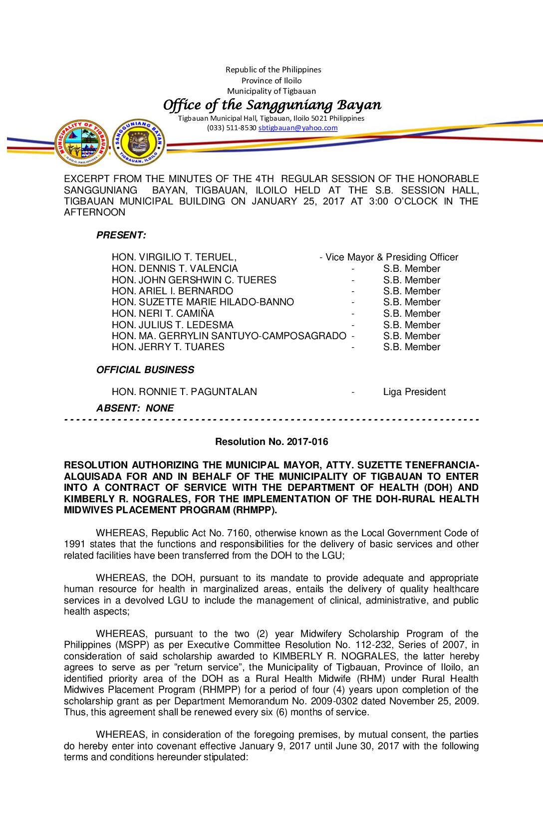 Resolution No. 2017-016 – RESOLUTION AUTHORIZING THE MUNICIPAL MAYOR, ATTY. SUZETTE TENEFRANCIA- ALQUISADA FOR AND IN BEHALF OF THE MUNICIPALITY OF TIGBAUAN TO ENTER INTO A CONTRACT OF SERVICE WITH THE DEPARTMENT OF HEALTH (DOH) AND KIMBERLY R. NOGRALES, FOR THE IMPLEMENTATION OF THE DOH-RURAL HEALTH MIDWIVES PLACEMENT PROGRAM (RHMPP).