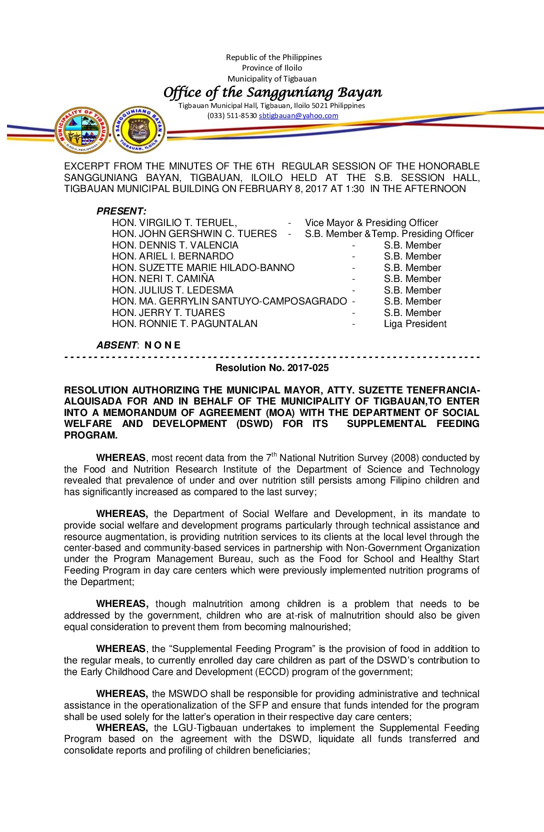 Resolution No. 2017-025 – RESOLUTION AUTHORIZING THE MUNICIPAL MAYOR, ATTY. SUZETTE TENEFRANCIA- ALQUISADA FOR AND IN BEHALF OF THE MUNICIPALITY OF TIGBAUAN,TO ENTER INTO A MEMORANDUM OF AGREEMENT (MOA) WITH THE DEPARTMENT OF SOCIAL WELFARE AND DEVELOPMENT (DSWD) FOR ITS SUPPLEMENTAL FEEDING PROGRAM.