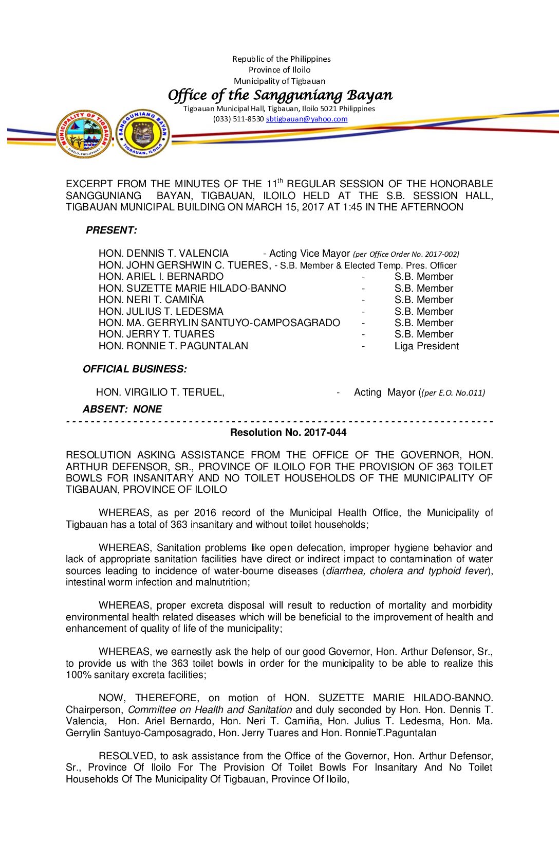 Resolution No. 2017-044 – RESOLUTION ASKING ASSISTANCE FROM THE OFFICE OF THE GOVERNOR, HON. ARTHUR DEFENSOR, SR., PROVINCE OF ILOILO FOR THE PROVISION OF 363 TOILET BOWLS FOR INSANITARY AND NO TOILET HOUSEHOLDS OF THE MUNICIPALITY OF TIGBAUAN, PROVINCE OF ILOILO