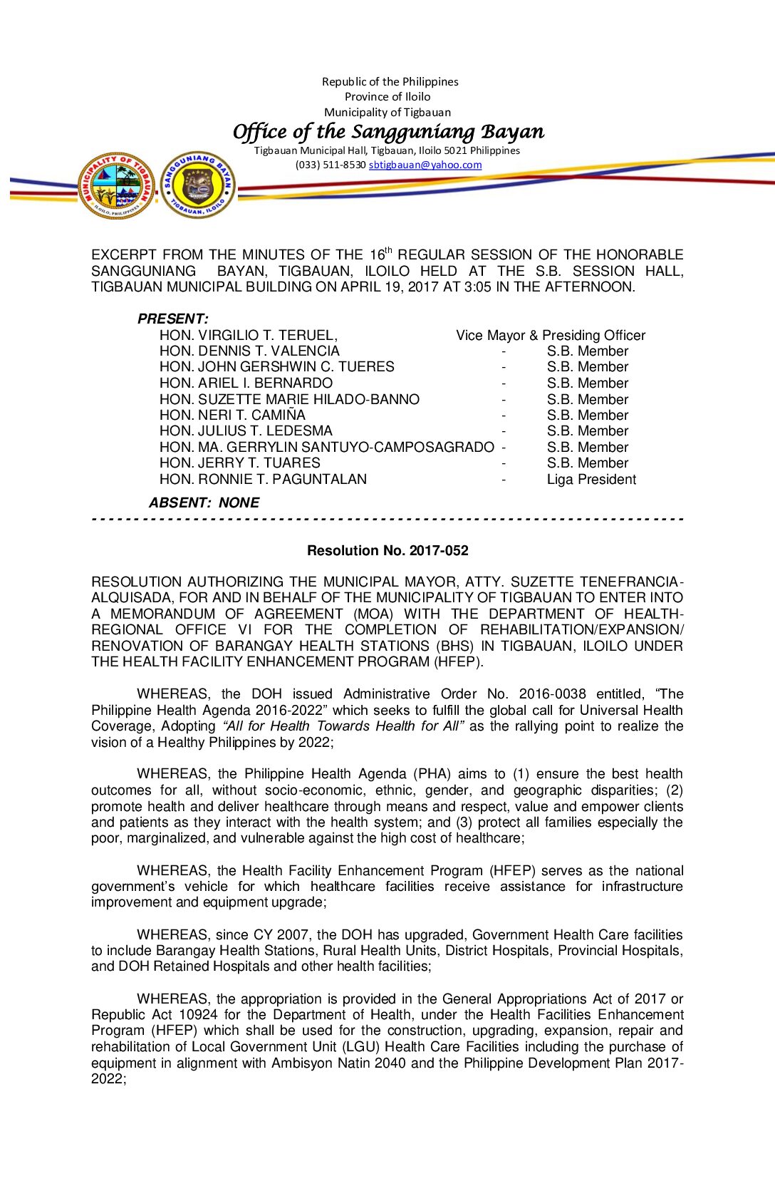 Resolution No. 2017-052 – RESOLUTION AUTHORIZING THE MUNICIPAL MAYOR, ATTY. SUZETTE TENEFRANCIA- ALQUISADA, FOR AND IN BEHALF OF THE MUNICIPALITY OF TIGBAUAN TO ENTER INTO A MEMORANDUM OF AGREEMENT (MOA) WITH THE DEPARTMENT OF HEALTH- REGIONAL OFFICE VI FOR THE COMPLETION OF REHABILITATION/EXPANSION/ RENOVATION OF BARANGAY HEALTH STATIONS (BHS) IN TIGBAUAN, ILOILO UNDER THE HEALTH FACILITY ENHANCEMENT PROGRAM (HFEP).