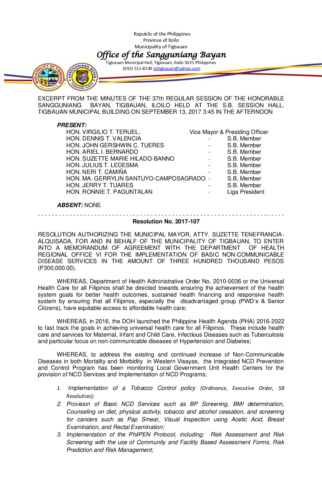 Resolution No. 2017-107 – RESOLUTION AUTHORIZING THE MUNICIPAL MAYOR, ATTY. SUZETTE TENEFRANCIA- ALQUISADA, FOR AND IN BEHALF OF THE MUNICIPALITY OF TIGBAUAN, TO ENTER INTO A MEMORANDUM OF AGREEMENT WITH THE DEPARTMENT OF HEALTH REGIONAL OFFICE VI FOR THE IMPLEMENTATION OF BASIC NON-COMMUNICABLE DISEASE SERVICES IN THE AMOUNT OF THREE HUNDRED THOUSAND PESOS (P300,000.00).